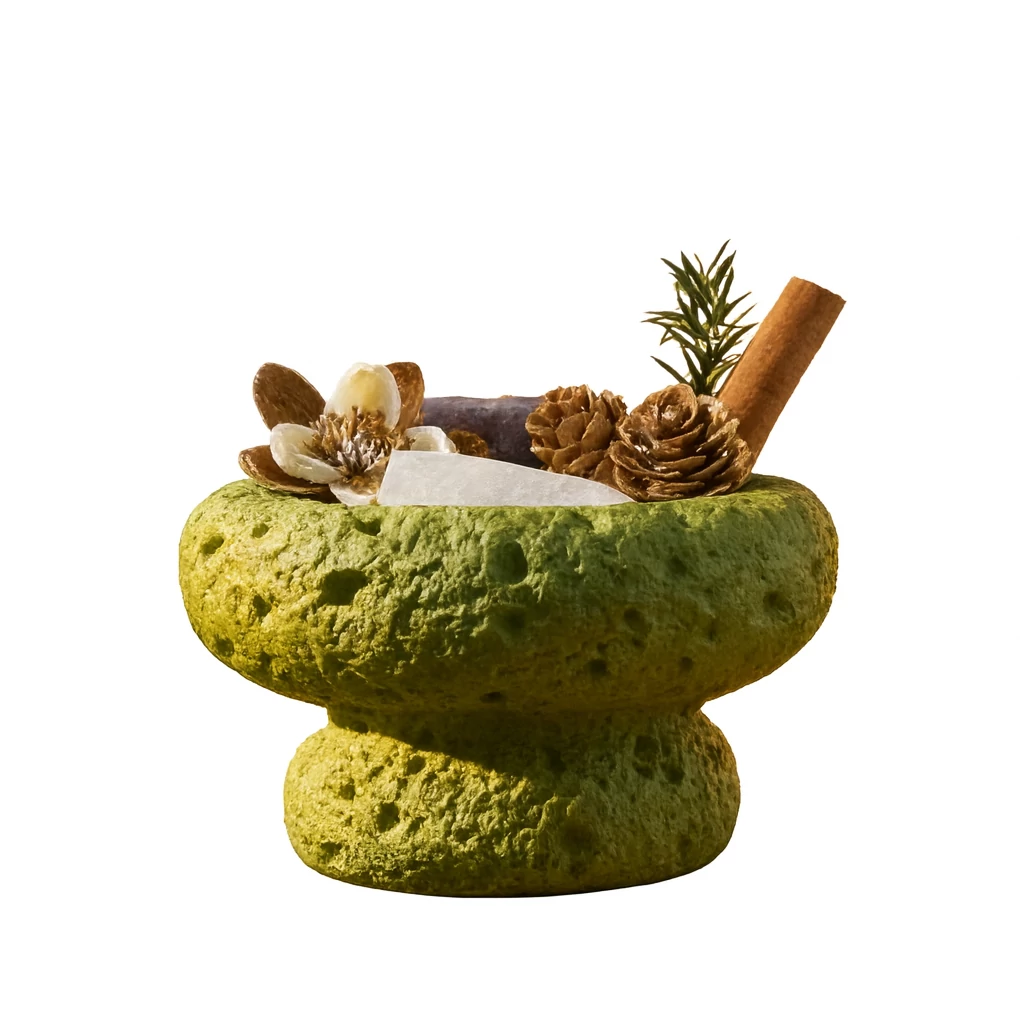 A diffúzor belsejét ásványok, apró tobozok, fahéjrúd és más természetes dekorok díszítik, amelyeket mindenki saját ízlése szerint rendezhet el. Nincs két egyforma kehely, hiszen minden darab a természet változatosságát és a te személyes stílusodat hordozza magában.