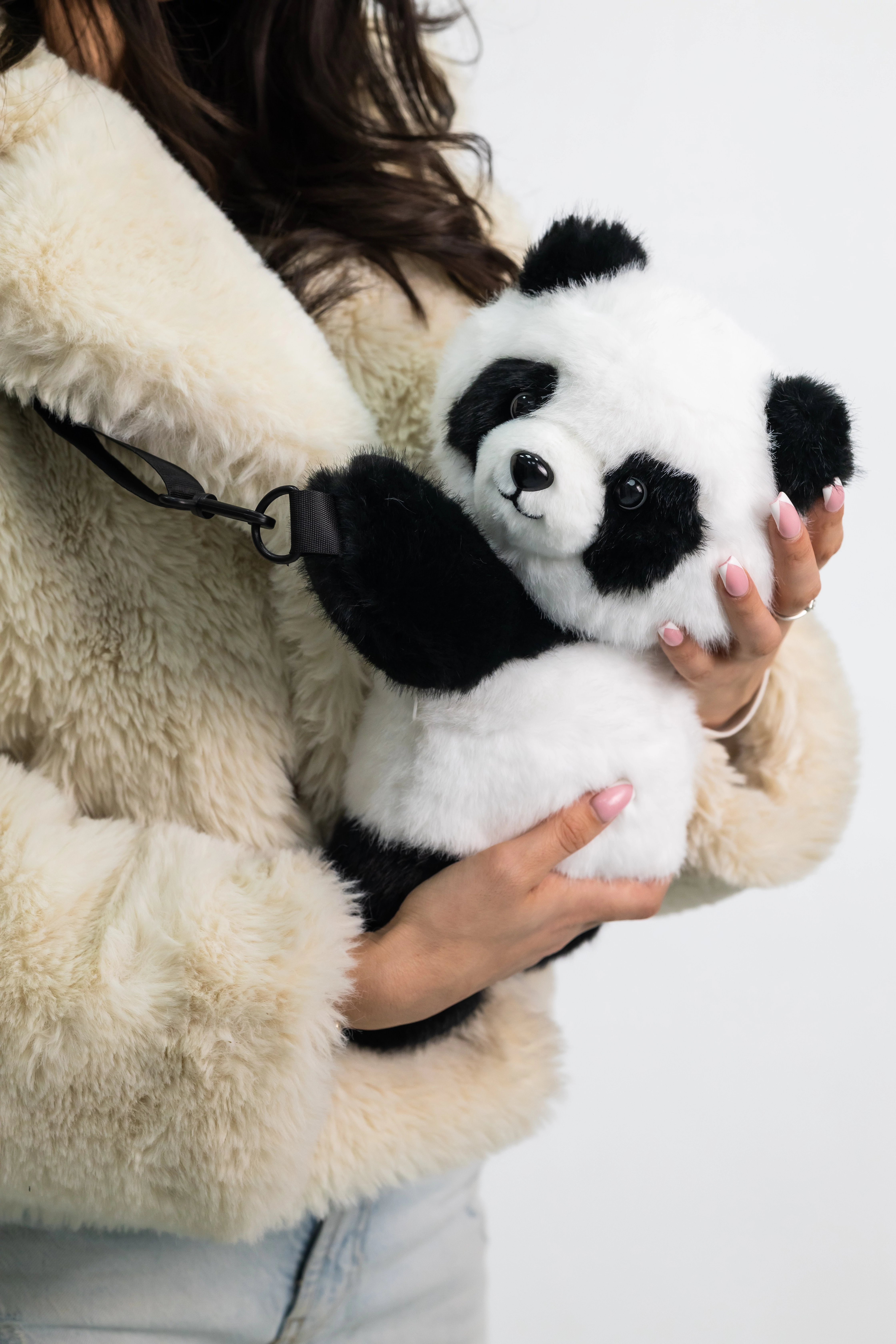 A panda mellkasán található rejtett zseb táskaként is praktikussá teszi: elfér benne néhány apró kincs, zsebkendő, kis játék vagy egy fontos emlék. A pánt levehető, így a panda könnyedén átalakul hordható társból ölelni való plüssé.