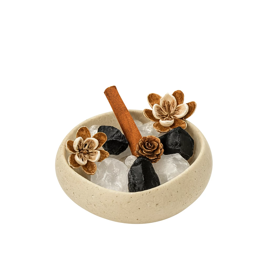 A Stone Harmony Diffuser – Kőharmónia diffúzor a kollekció legletisztultabb, modern darabja. Világos krém vagy zöld színű kőtálban elhelyezett ásványokkal, kristályokkal, szárított dekorokkal és fahéjrúddal teremti meg a természetes, nyugodt illatélményt.